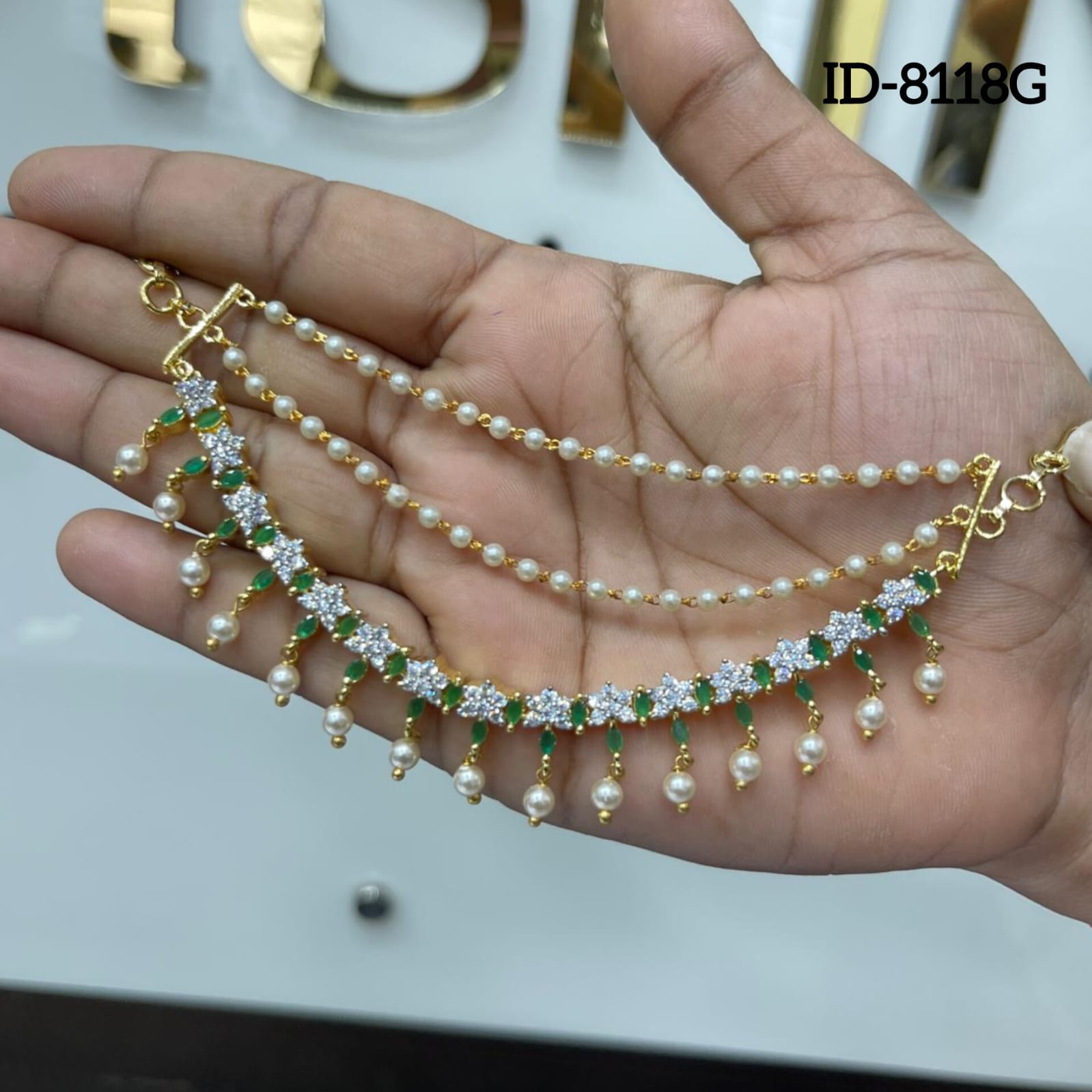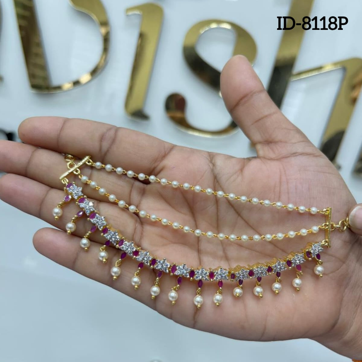 Material - Premium Quality Diamond look-alikePolish – Bright GoldBase Metal - Copper & Brass AlloyStone – Cubic zirconia stones & Pearl beads